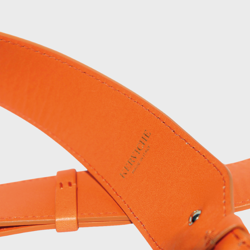 Nous sélectionnons un cuir de bovin d’Espagne pour sa tenue et sa texture raffinée. Le coloris Mandarine se distingue par un cuir d’agneau italien, souple et lumineux.