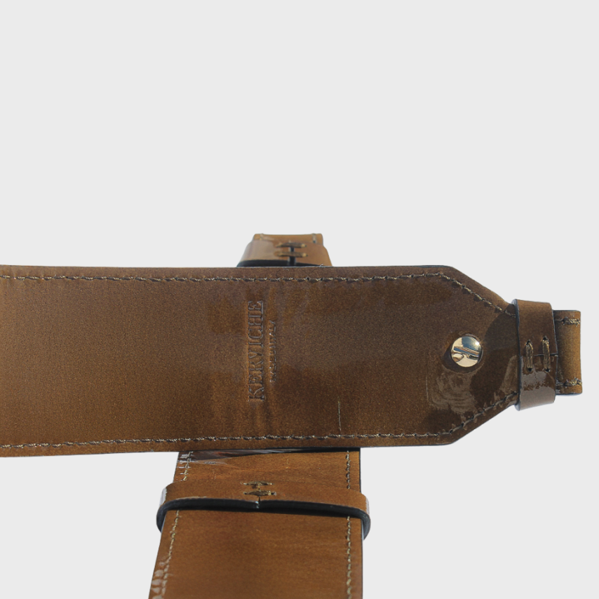 La bandoulière vernis KERVICHE (45 mm) révèle toute son audace à travers des finitions brillantes et éclatantes.